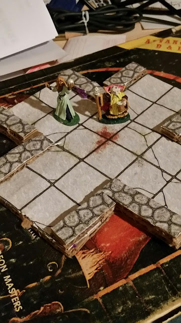 My first attempt at building 2.5 dimensional dungeon tiles out of paper and cardboard. I'm using the PDF images and instructions kindly provided by +Kristian Richards at The Crooked Staff. I started cutting with a box cutter, but found that using a Dremel rotary cutter works faster, easier and better. Just remember to put scrap wood under it, the blade will go right through any thin plastic cutting board. I've also switched to a glue stick, instead of a glue gun as it's easier to spread a smooth layer.
